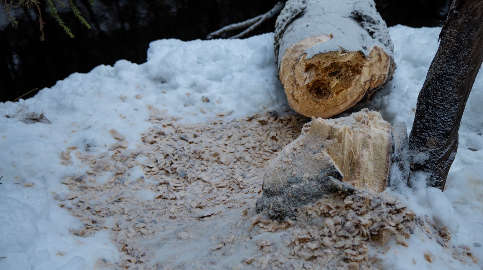 We walked back up to the hut at the level of the waterfall top and decided to also walk the Geo Trail which was about 1.5km in length. It had not been walked for about a week and we only saw one other person that walked the trail into the opposite direction. Luckily there wasn't a lot of snow so it was quite easily walkable even with children. The water level had dropped after the river had frozen, so the ice sheet had collapsed. We also saw some trees that had been cut down by beavers.